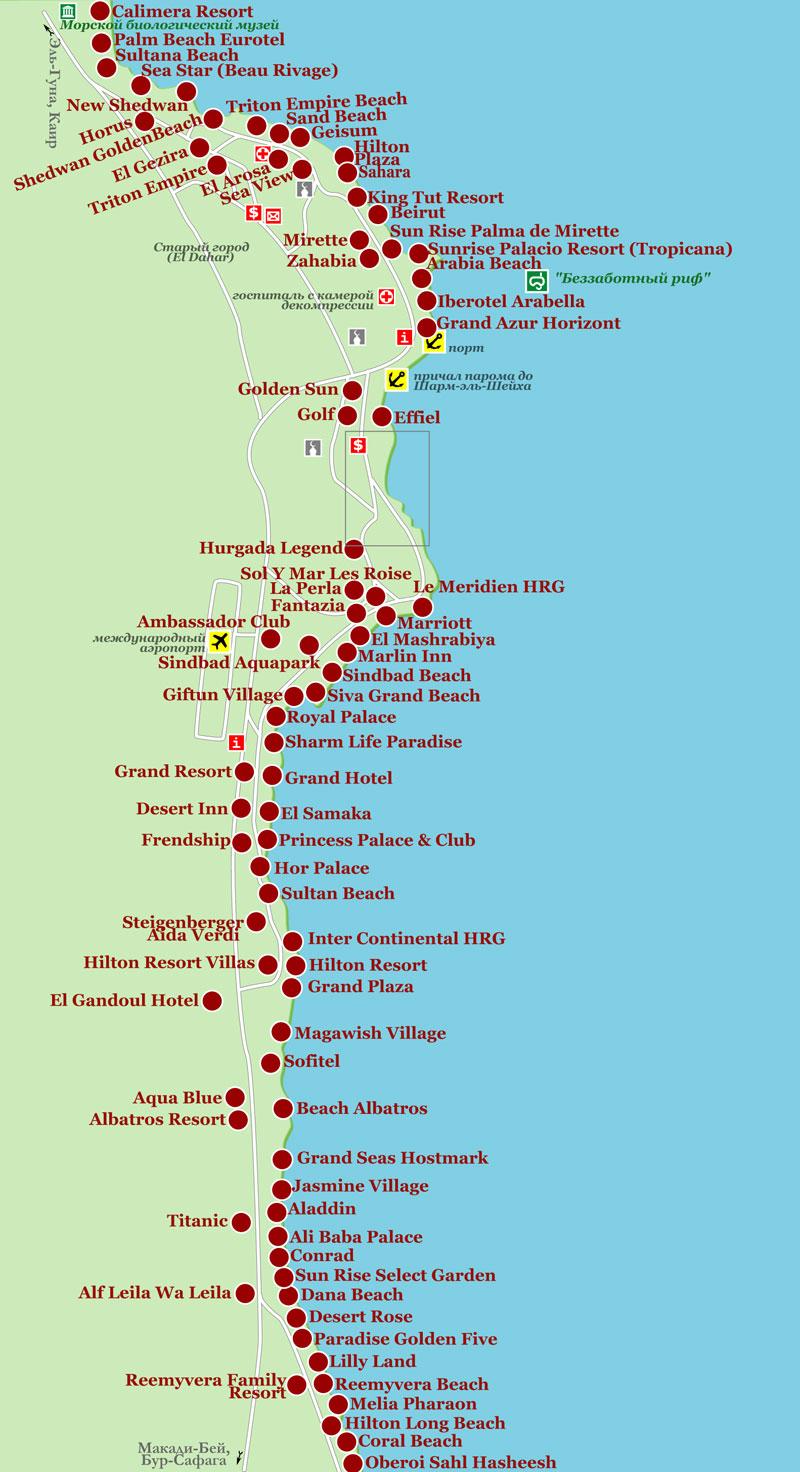 Карта Хургады. На карте отмечены основные отели Хургады.